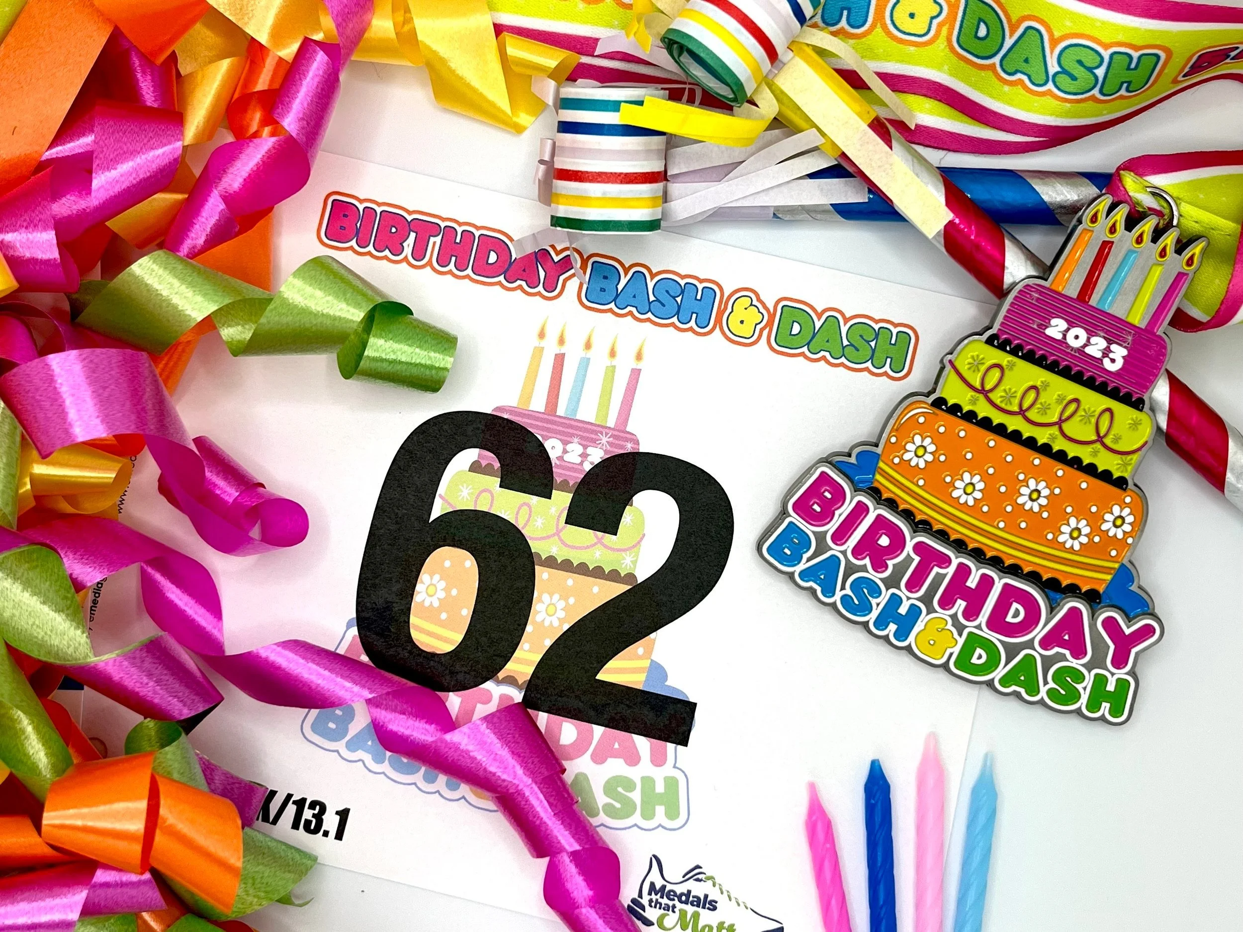 This 3’x4’ medal is made of high-quality 3.5 mm zinc alloy medal and features a brightly detailed 11-color birthday cake image with a co-ordinating 1 1/2” wide ribbon. The runner’s bib is made of durable Tyvek and measures 5.75” x" 7.5”. The T-shirt is 65% poly, 35% rayon quality dry-fit fabric, featuring tag-less comfort.